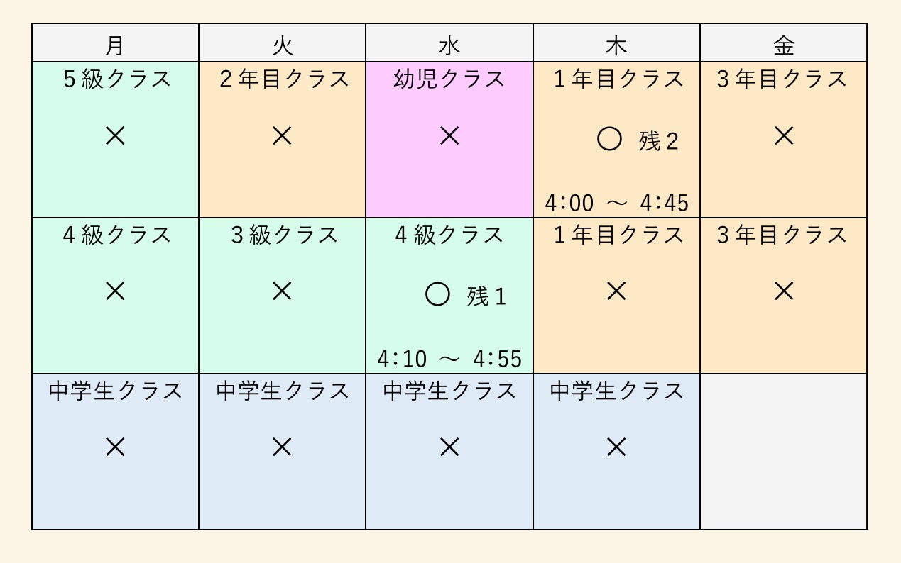 現在、ご入会が可能なのは○のついているクラスです。体験レッスンのご希望やご質問等ございましたら、CONTACTよりお問い合わせください。